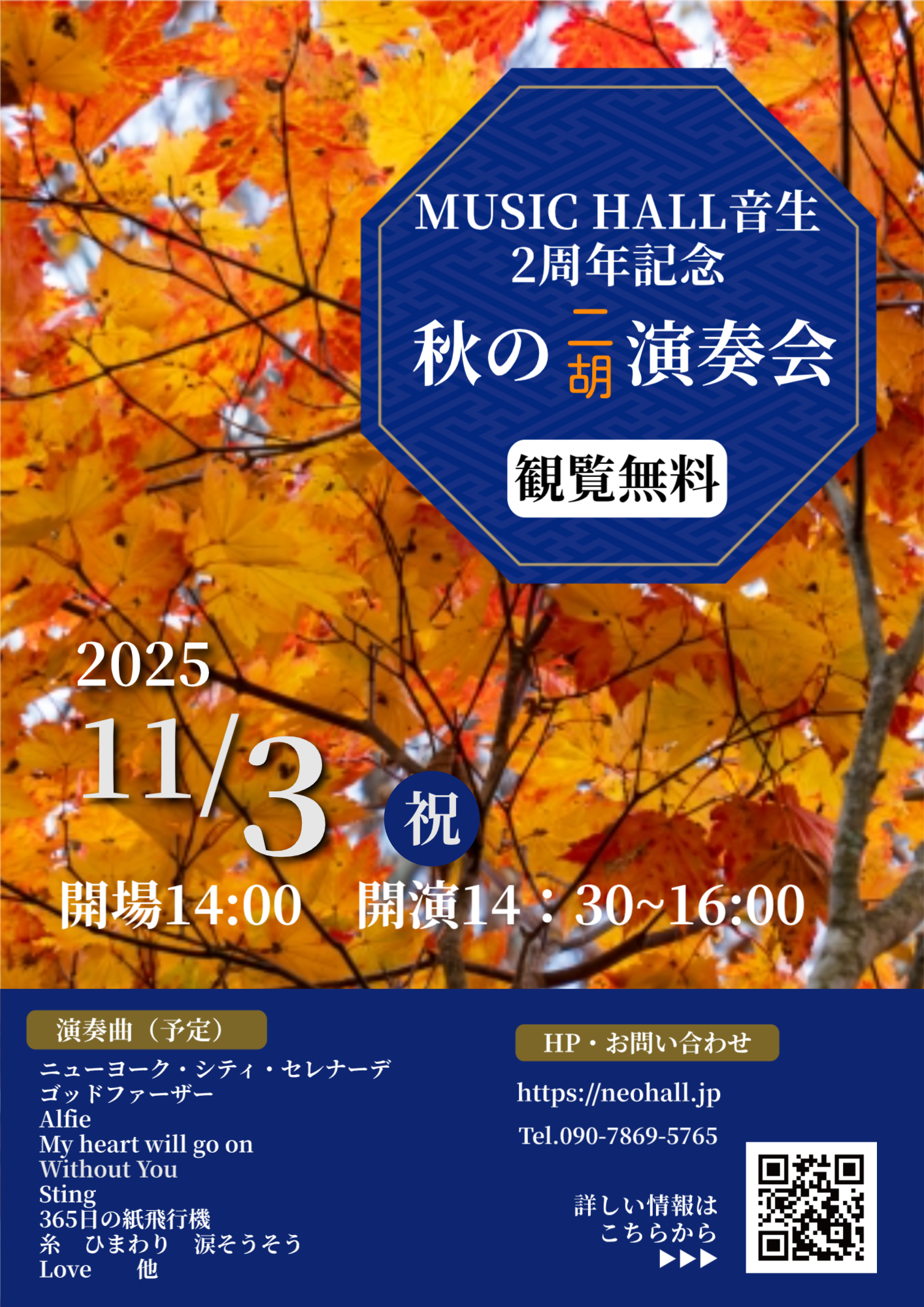 [終了しました] 2025年11月3日(月・祝) MUSIC HALL 音生 2周年記念 秋の二胡演奏会(観覧無料)